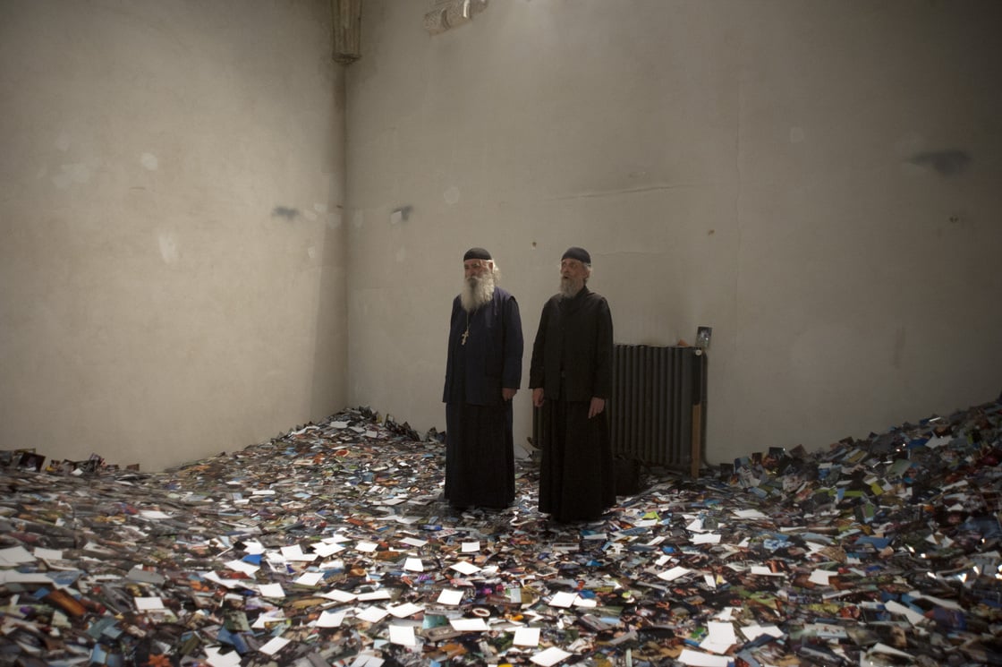 I am holding a photograph of a young woman. She is wearing a white dress and gloves and is sitting on the floor in a bare room. To the left of her sits a man, but only his shoulder and part of one hand are visible. The photograph has been torn in two.